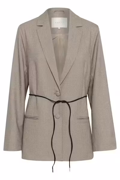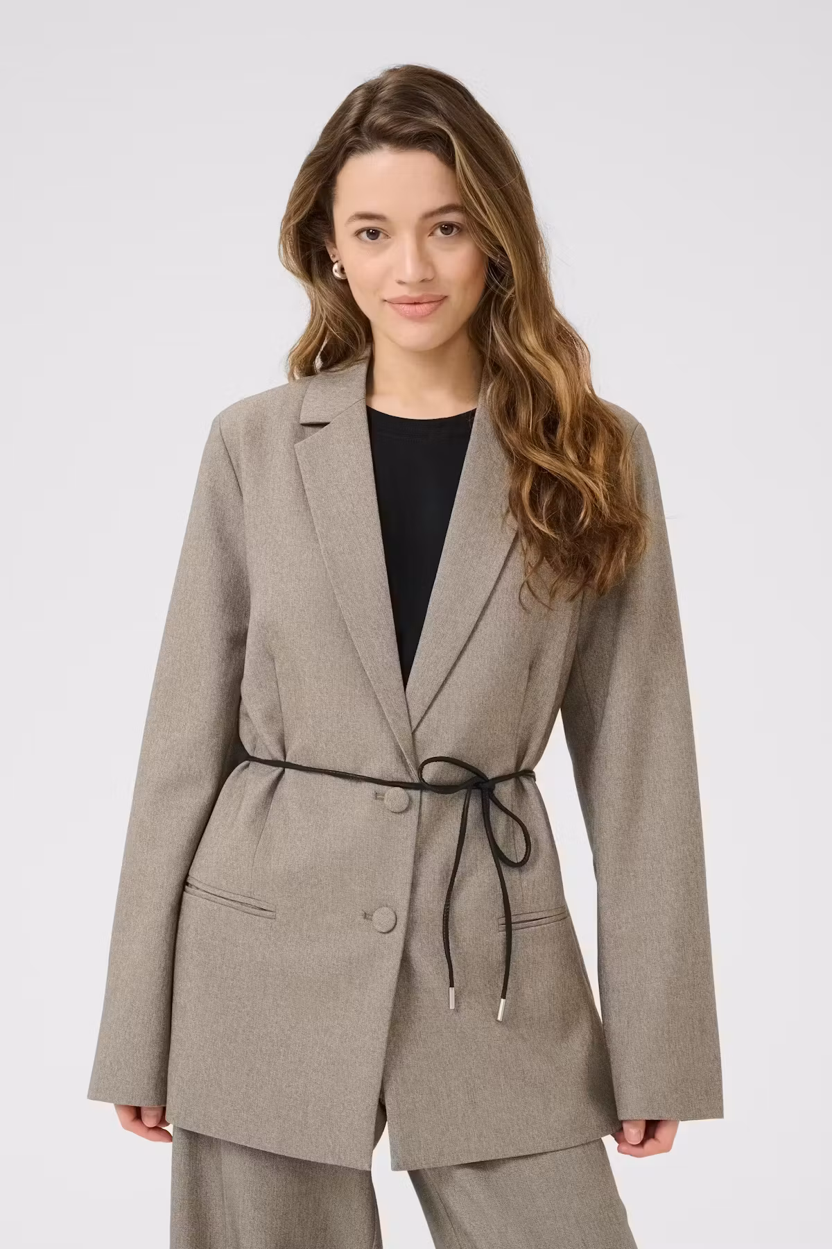 Kavaj med avslappnad passform och knytband i midjan. Klassisk krage, långa ärmar och knäppning framtill. Bekväm och stilsäker för både arbete och fritid.