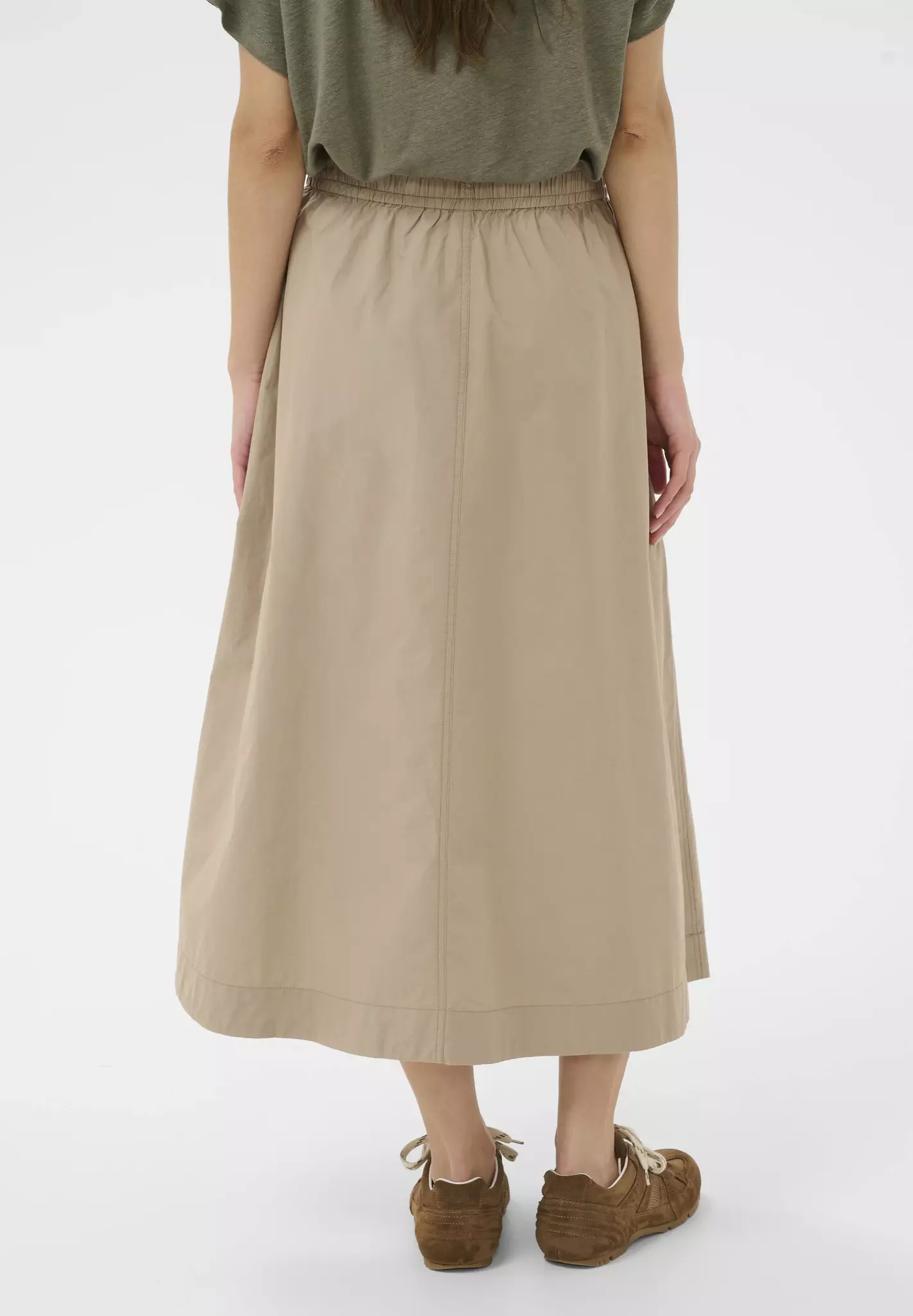 Midikjol med avslappnad passform och elastisk midja. Små rynkningar och mjuk, slät yta ger en modern, stilren känsla till siluetten.100% org. bomull.
