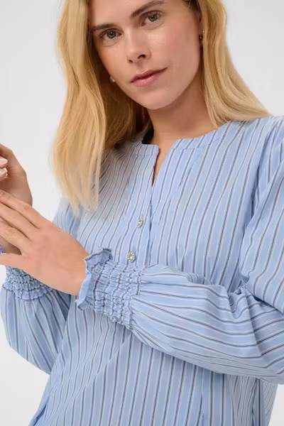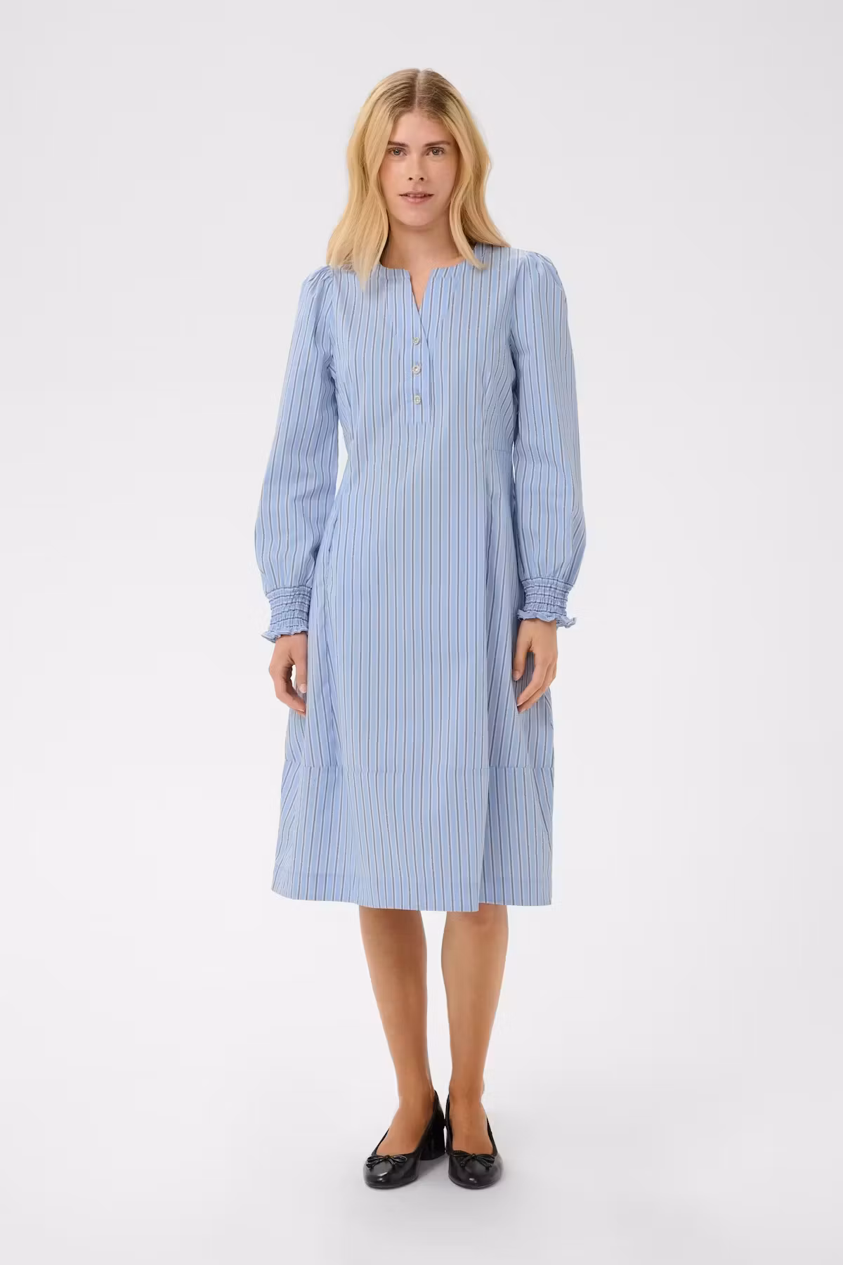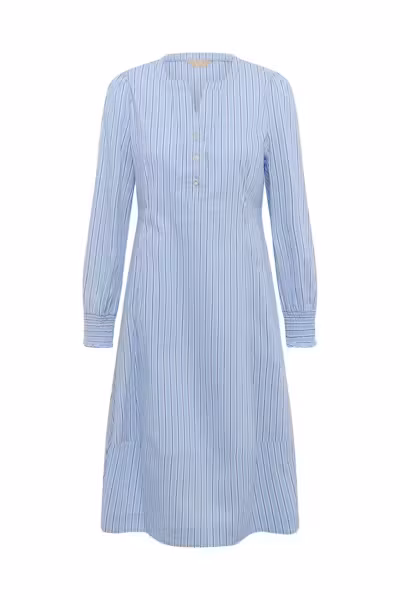 Klänning med V-ringning, strassknappar, långa ärmar med smockade muddar.