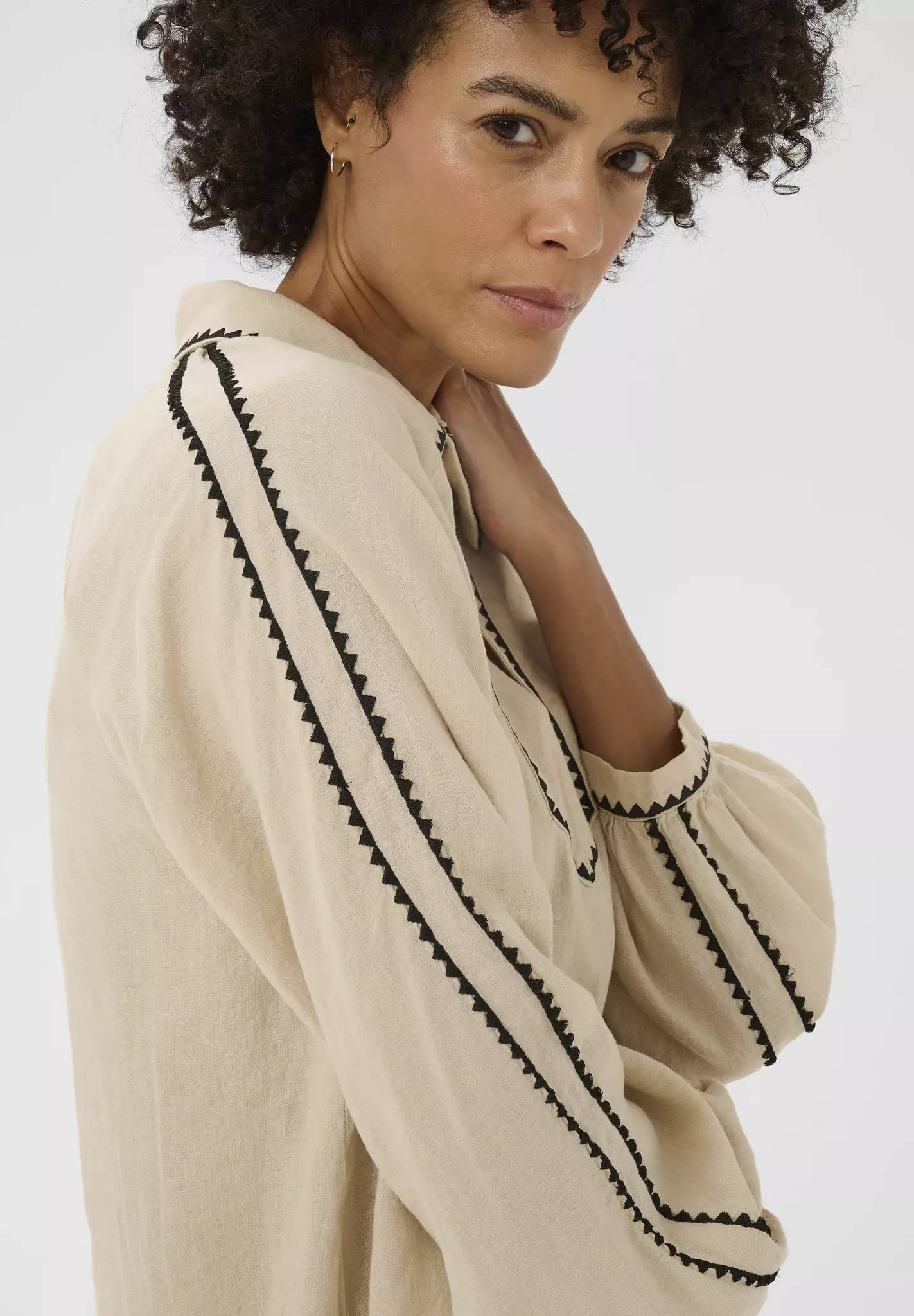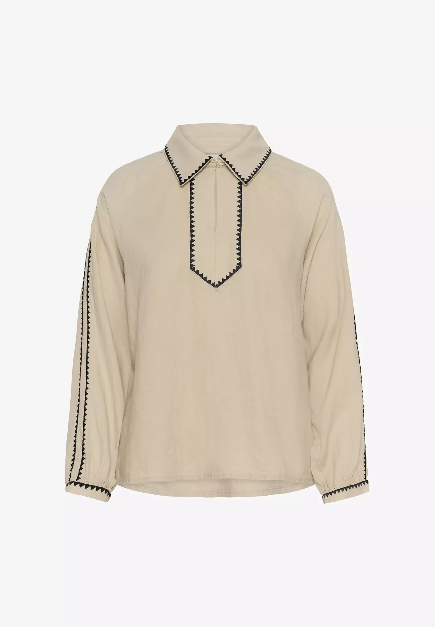 Detaljerad blus i skönt material, med kontrasterande kantband. Den klassiska kragen och de subtila detaljerna längs ärmarna tillför en sofistikerad touch, vilket gör den till ett mångsidigt plagg för olika tillfällen.