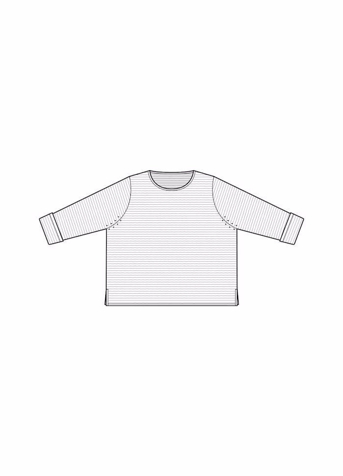 Tröjan har vikta ärmslut, och slitsar i sidosömmarna.